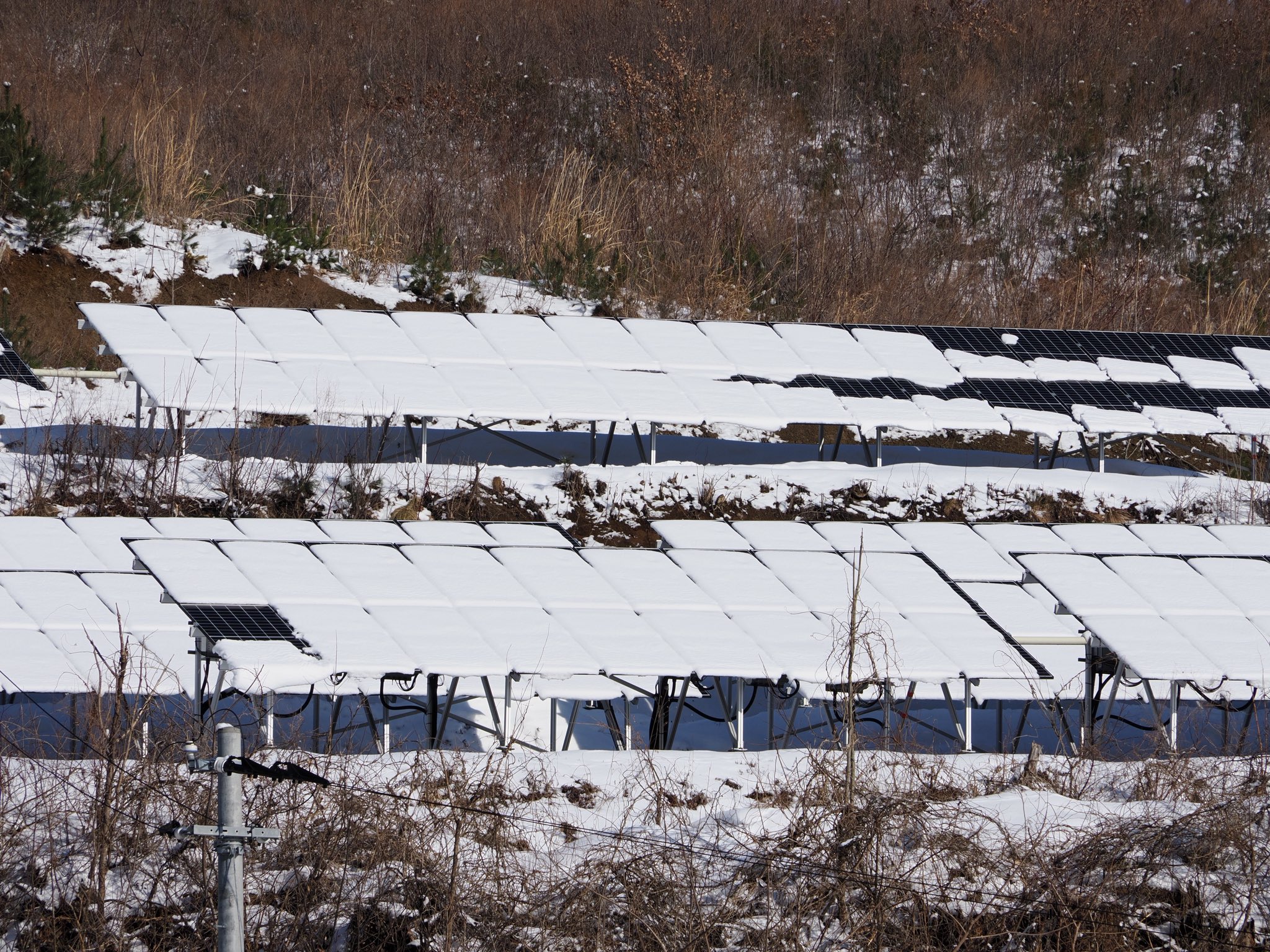 メガソーラーではなく個人所有の施設のようだが、積雪地での太陽光発電はやはり効率悪そう。土地を遊ばしておいても何だし、何もしないよりはマシ程度の感覚なのだろうけど